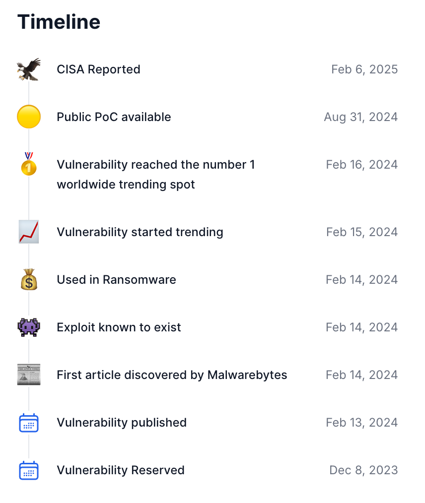 - When available and publicly disclosed, we include links to proof-of-concept (PoC) exploits, or tag the vulnerability as actively exploited in the wild. However, we never host code ourselves.